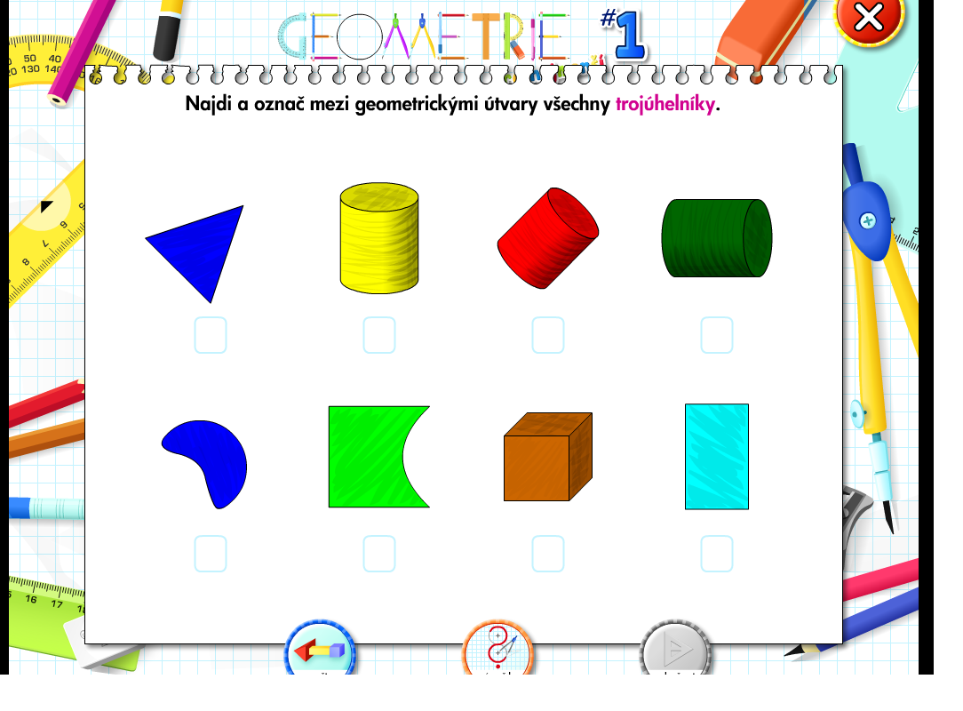 Tentokrát si zopakujte a procvičte, co jste se naučili z geometrie. Využijte, že didakta.cz je zdarma pro všechny lehce ke stažení zde Spusťte si Geometrii pro nejmenší 1. Zadejte si tělesa a geometrické útvary. Dozvíte se sice i věci navíc, ale to nebude na škodu.
