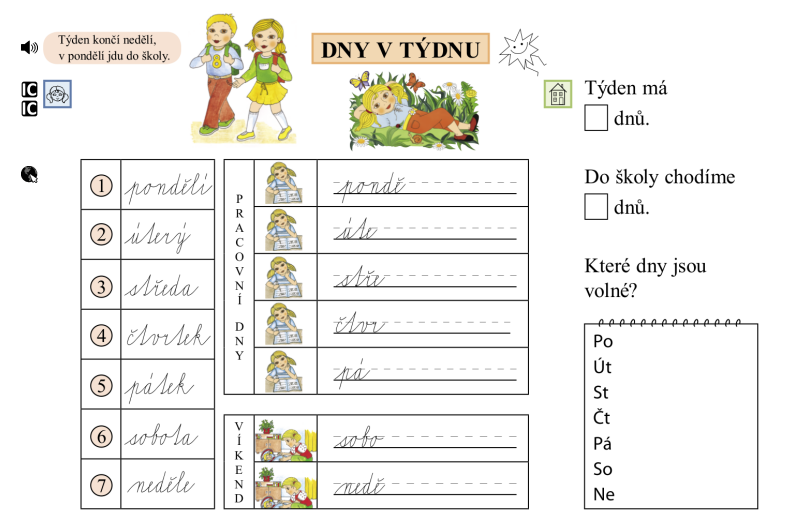 Nejprve dětem přečtěte tuto básničku a schválně vynechejte některé pasáže. Nechte je zamyslet se nad tím, jestli ví jaká slova tam chybí. Přečtěte básničku ještě jednou a slova do ní společně doplňte. Řekněte jim, že dny v týdnu jsou hlavní téma první části Prvouky pro tento týden.